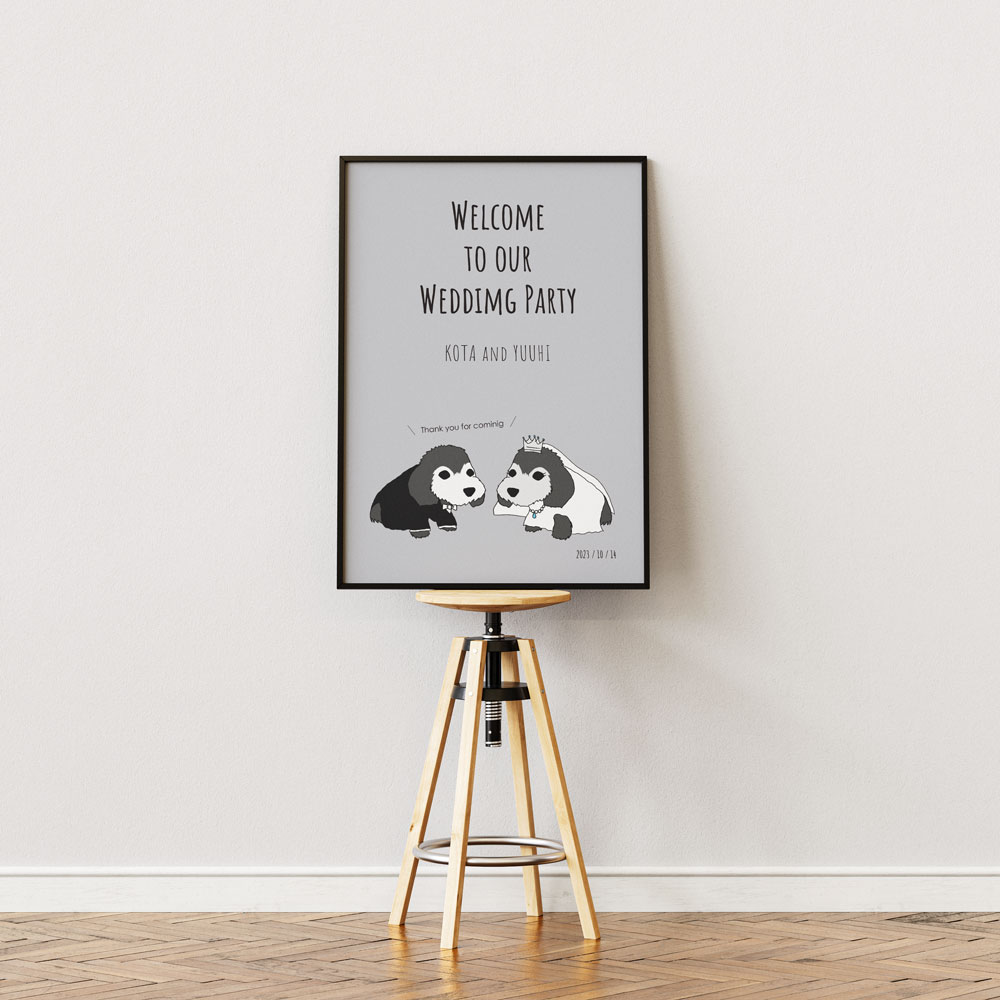 新郎新婦の大切なわんちゃんにドレスとタキシードを着せてウェルカムボードを作りました。